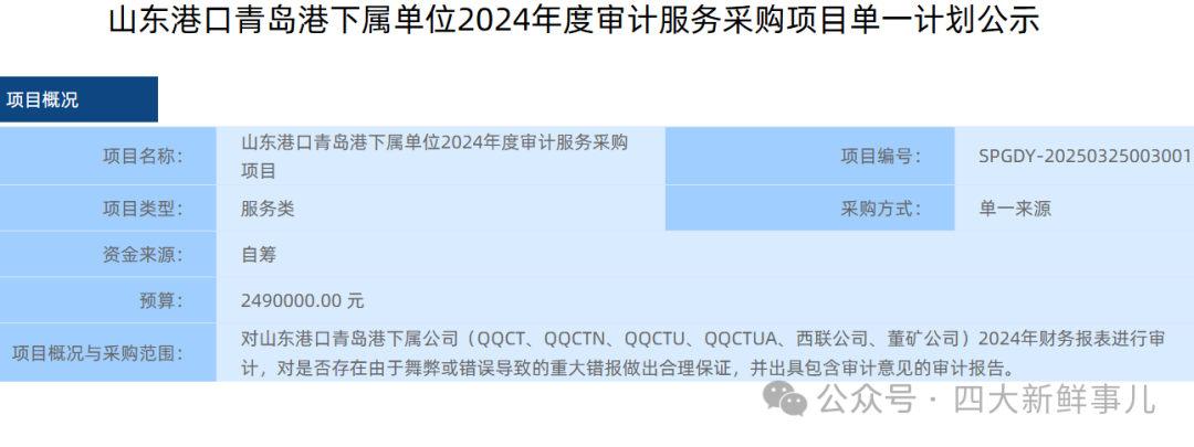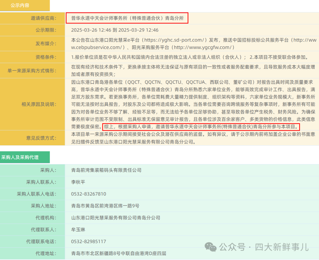 据悉,2025年3月26日,青岛前湾集装箱码头有限责任公司公示了此审计采购计划服务预算为249万元,邀请普华永道中天会计师事务所(特殊普通合伙)青岛分所作为单一来源供应商,对山东港口青岛港下属6家公司2024年财务报表进行审计,对是否存在由于舞弊或错误导致的重大错报做出合理保证,并出具包含审计意见的审计报告。 该业务此前都是普华永道中天青岛分所审计。