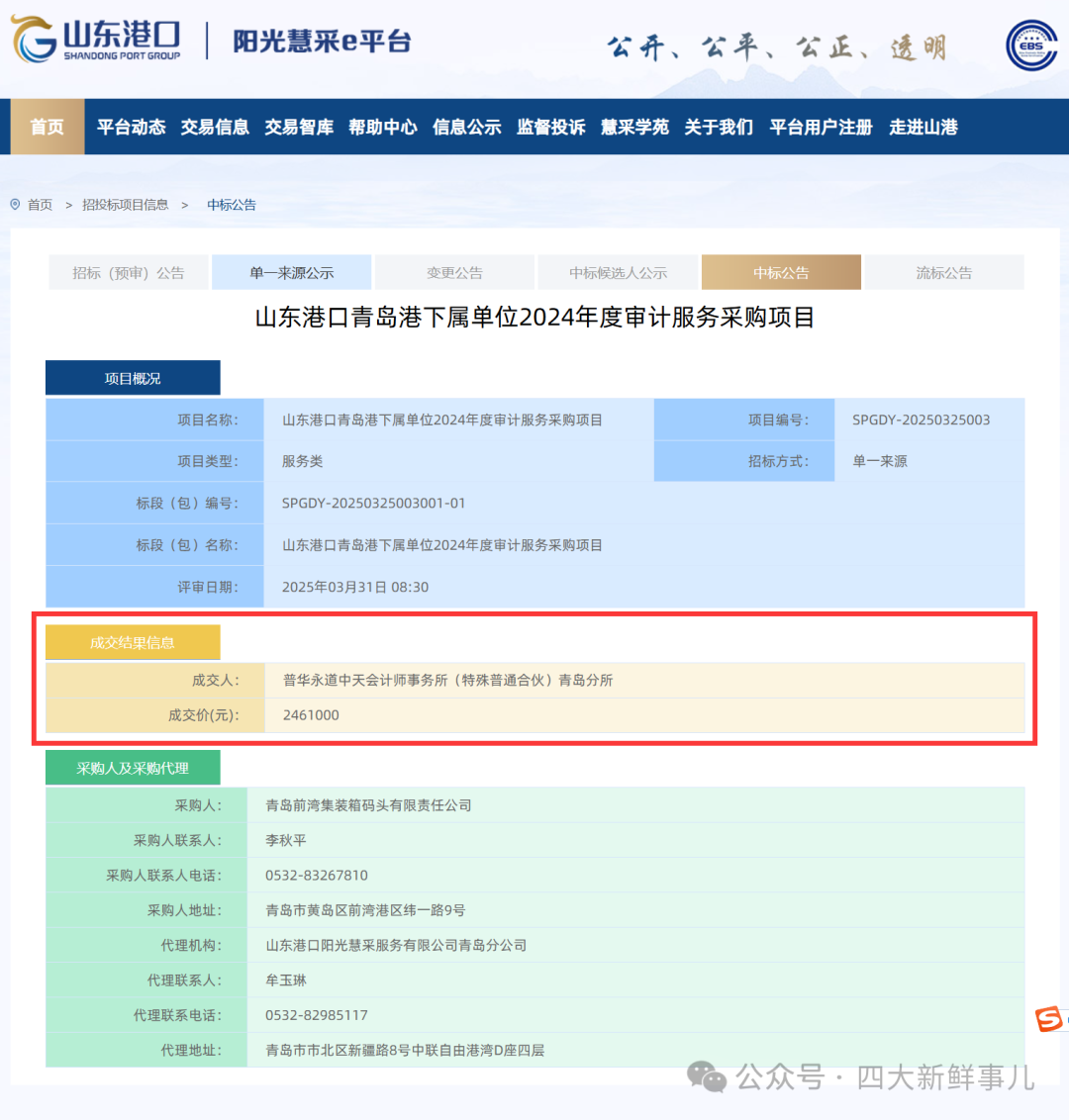 2025年4月2日,青岛前湾集装箱码头有限责任公司发布《山东港口青岛港下属单位2024年度审计服务采购项目》,成交结果信息显示普华永道中天会计师事务所(特殊普通合伙)青岛分所中标,成交价格为246万。