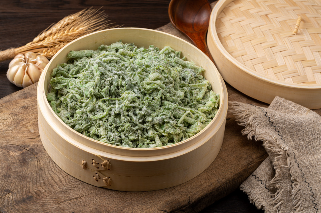 其中最常用的烹饪方法是蒸:将面粉裹在野菜上,先上笼屉蒸熟后,或浇上鲜辣的蒜泥汁,成为一道爽口凉菜;或下锅加蒜苗、韭菜等炒制后,成为一道热菜。