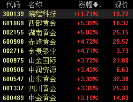 晓程科技涨超11%,鹏欣资源涨超7%,赤峰黄金、西部黄金、山金国际跟涨。消息面上,国际金价持续刷新历史新高。