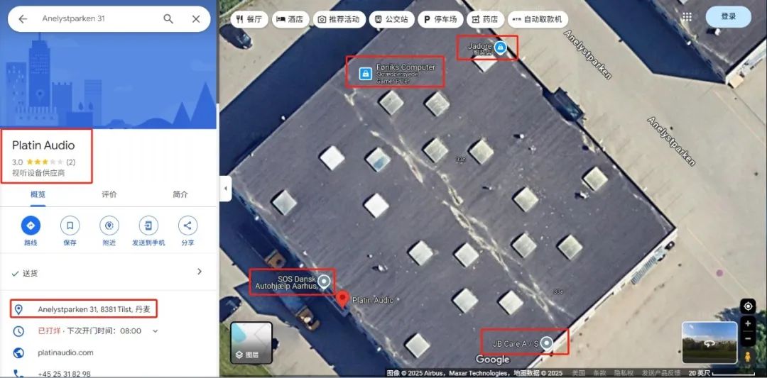而据地图软件公开信息,截至查询日2025年4月18日,地址“Anelystparken 31 C,8381 Tilst”的建筑物地址名称系“Platin Audio”,地图软件定义的标签为“视听设备供应商”。周边商业分别为电脑城、服装店、JB Care A/S医疗器材店、SOS Dansk Autohjælp Aarhus丹麦汽车救援等。