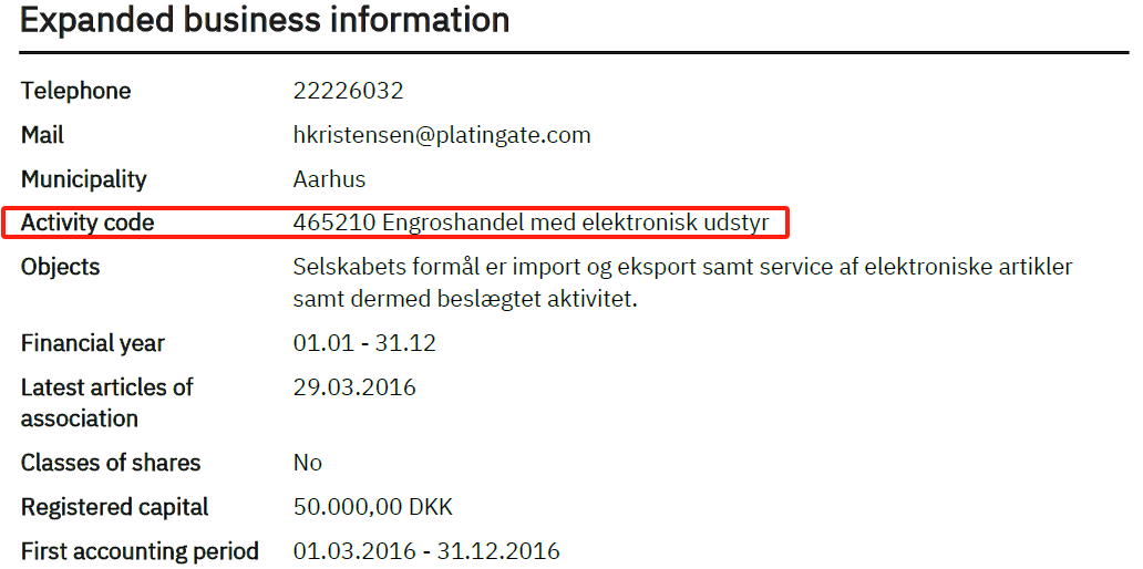 1.2 丹麦官方信息显示PG公司活动代码系电子设备批发贸易,或从事电子产品的进出口及相关服务