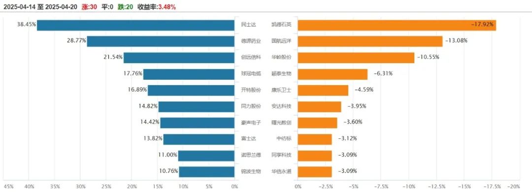 上周(4月14日-4月20日),北证50指数周增长3.48%至1328.89点。北证50成分股中,30只上涨,0只平盘,20只下跌。