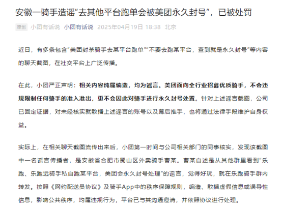 针对“二选一”问题,4月19日,美团曾发布声明称,“美团封杀骑手去某平台跑单”“不要去跑某平台,查到就是永久封号”等相关内容纯属编造,均为谣言。美团面向全行业招募优质骑手,不会违规限制任何骑手的准入准出,更不会因此对骑手进行永久封号处置。