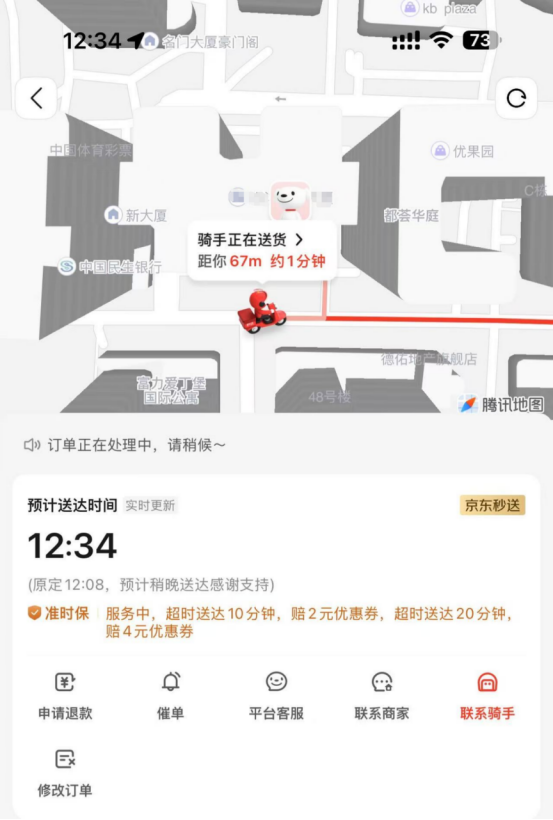 中午11点28分,广州消费者杨莉(化名)在京东外卖下单一份餐食,平台预计12点08分送达。根据她提供的订单截图显示,直至12点34分,超时26分钟后,骑手仍未送达。