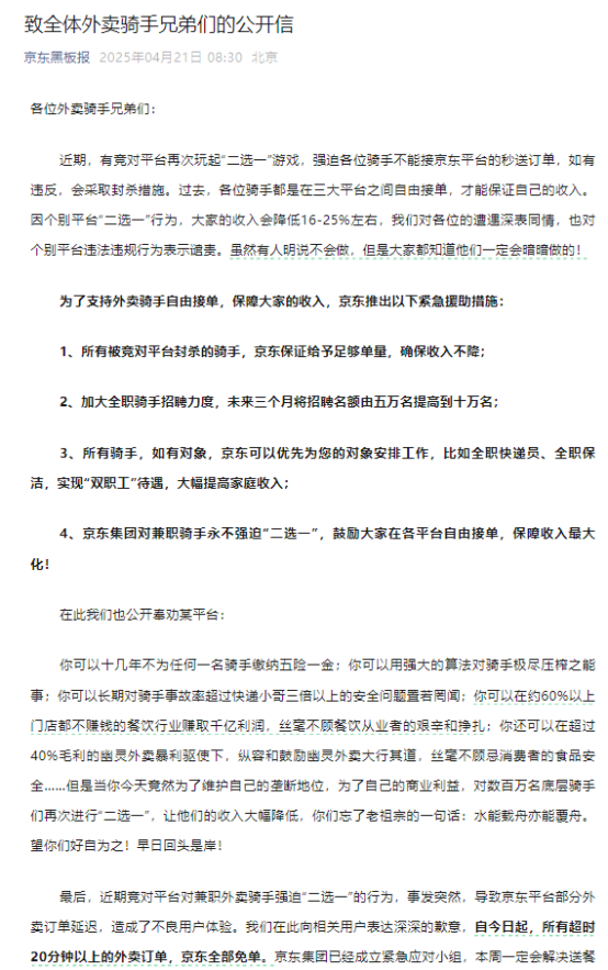 4月21日,京东集团发布《致全体外卖骑手兄弟们的公开信》称,近期竞对平台对兼职外卖骑手强迫“二选一”的行为,事发突然,导致京东平台部分外卖订单延迟,造成了不良用户体验。