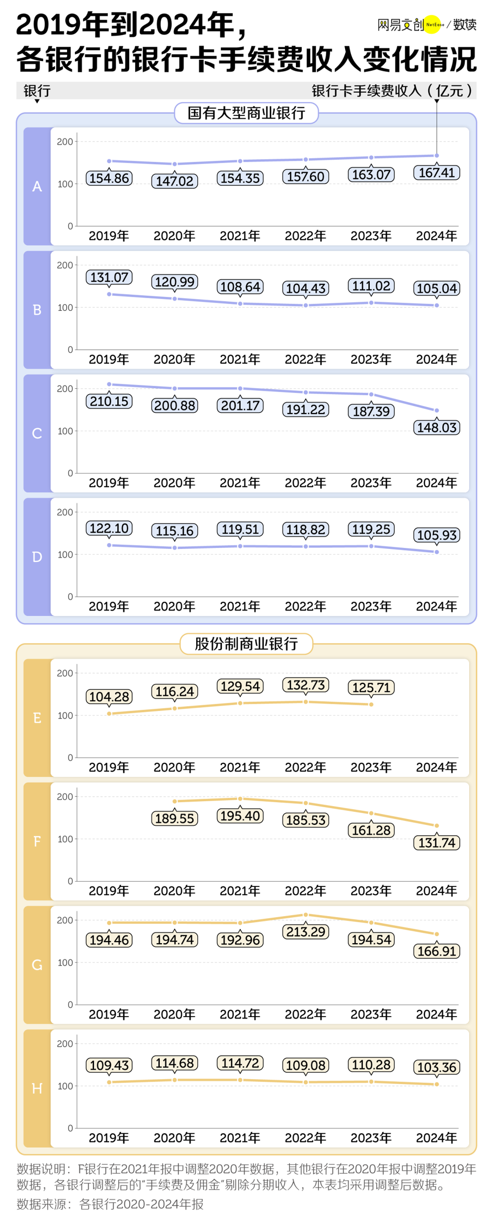而从 2019 年到 2024 年,我们统计的八家银行中,有六家银行卡手续费呈现整体下降趋势,有的降幅甚至达 30%。