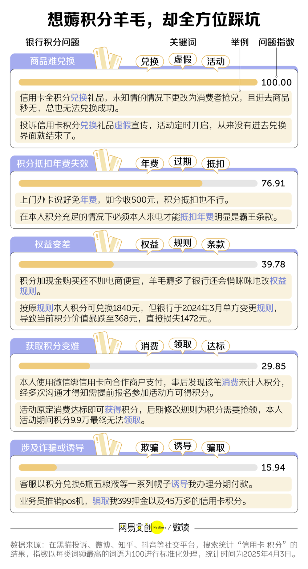 开卡时约定的积分抵扣年费时常失效,多倍积分活动减少后,积分获取也愈发艰难;而当银行随意修改积分兑换比例侵害消费者权益,选择诉讼和投诉的只是少数,大多数人选择咽下苦果。