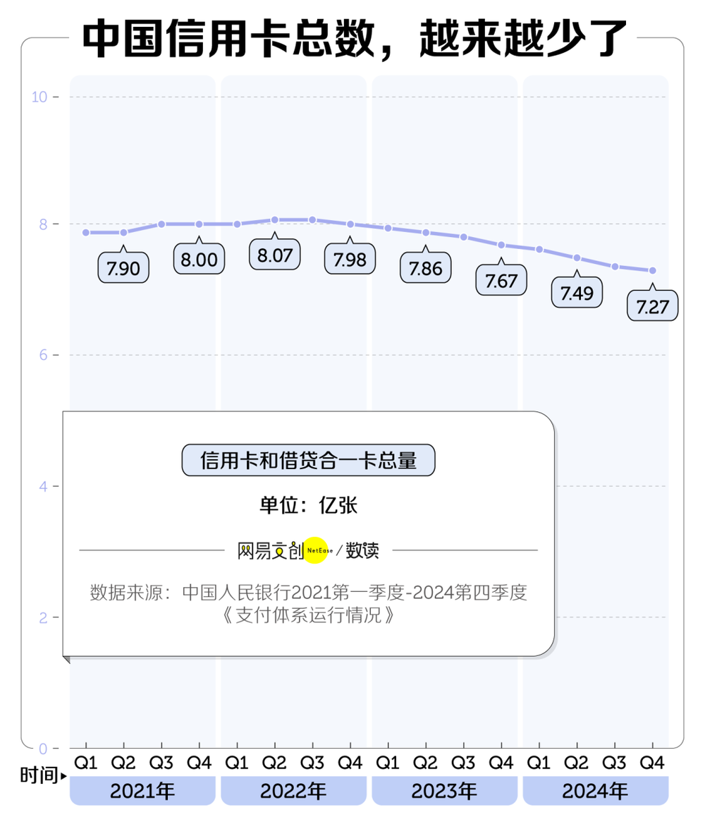 自 2022 年第三季度开始,信用卡和借贷合一卡总量九季度连跌,到 2024 年末仅剩 7.27 亿张。换言之,两年半时间里 8000 万张信用卡蒸发了。