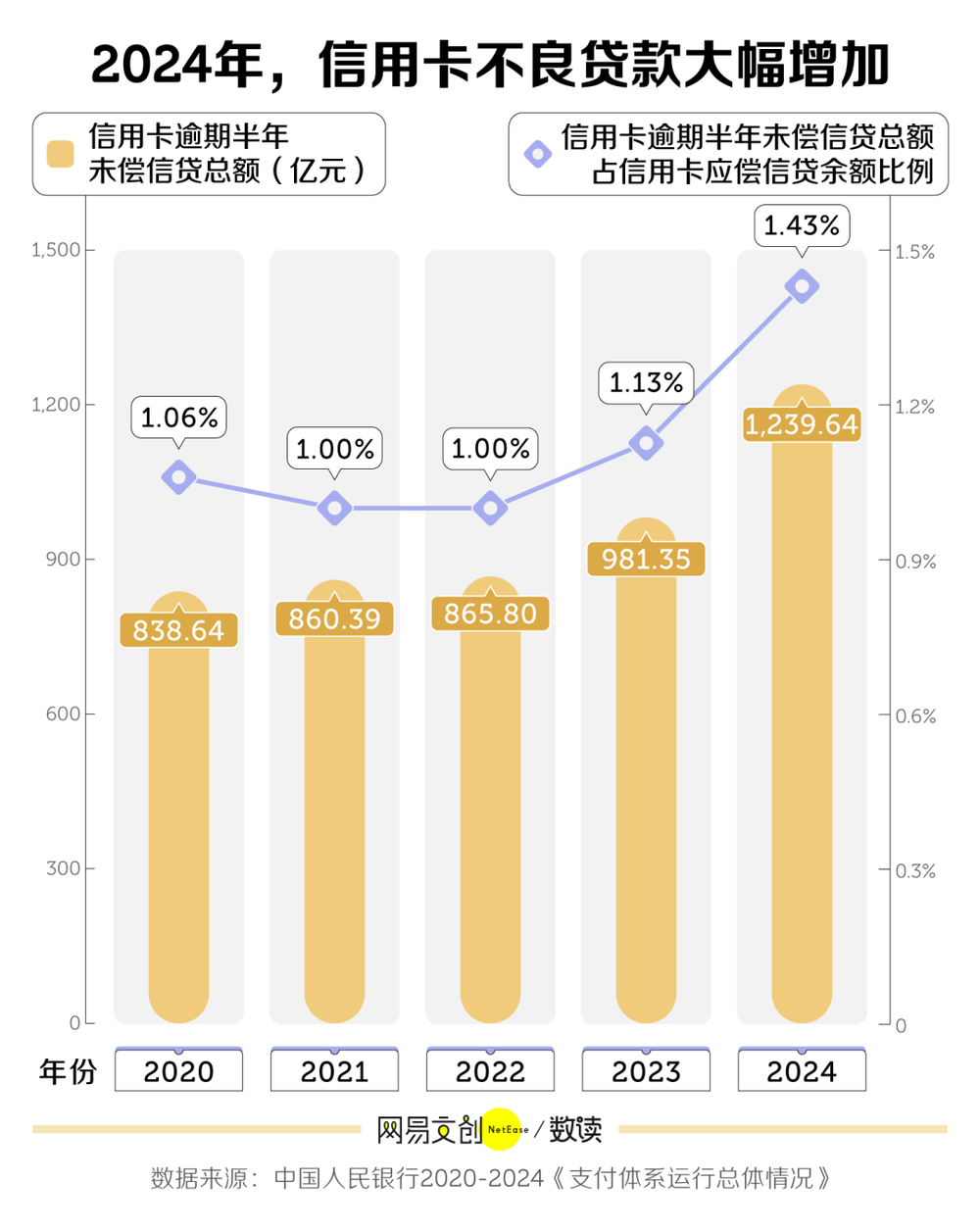 2020~2022 年,全国信用卡逾期半年未偿信贷总额稳定在 800 多亿元。2022 年后信用卡数量、人均持卡量在下降,但不良贷款却在增加,2024 年达 1239.64 亿元,同比增长 26.31%。