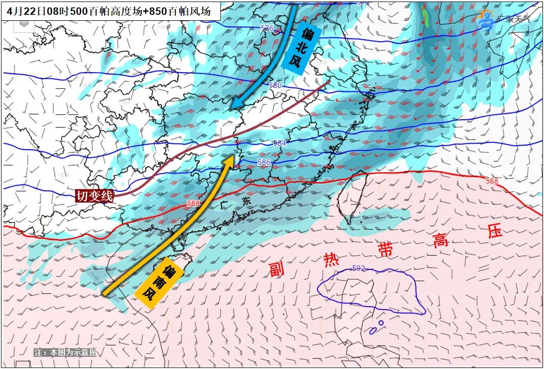 据预报,22日,冷暖气流交汇区域(切变线)位于江南一带,韶关、清远、肇庆处于副热带高压(简称副高)边缘不稳定区域,雷雨依旧活跃。