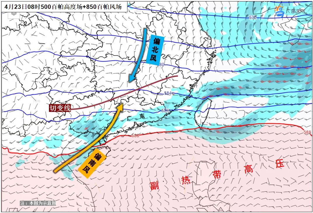 23日,副高南落,切变线逐渐南压到粤北,韶关、清远雨势加大,河源、梅州及珠三角北部雷雨也会趋于频繁。