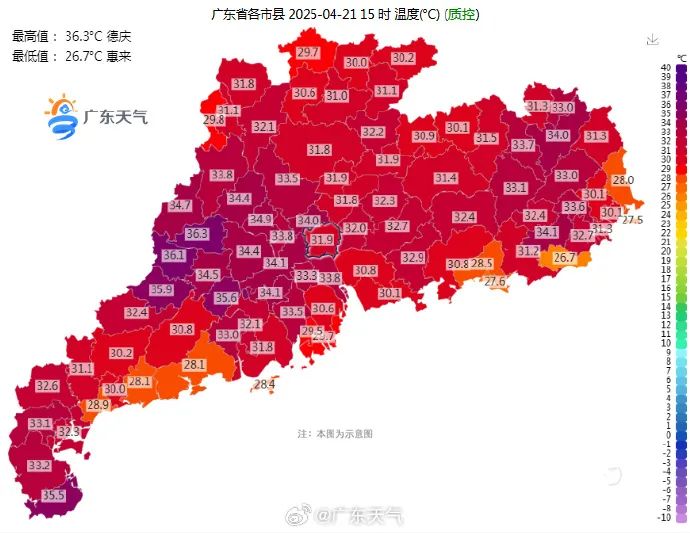 社交媒体截图据@广东天气,4月21日,广东大部受副热带高压控制,以晴热天气为主。截至21日15时,“鸡腿”已被烤到红通通,广东全省大部分地区的气温已超过30℃,徐闻、罗定、郁南、新兴、德庆已超过35℃。最高气温为36.3℃,出现在德庆。截至15时08分,广东全省有13个高温黄色预警生效中,天气又热又闷,大家要注意多喝水。