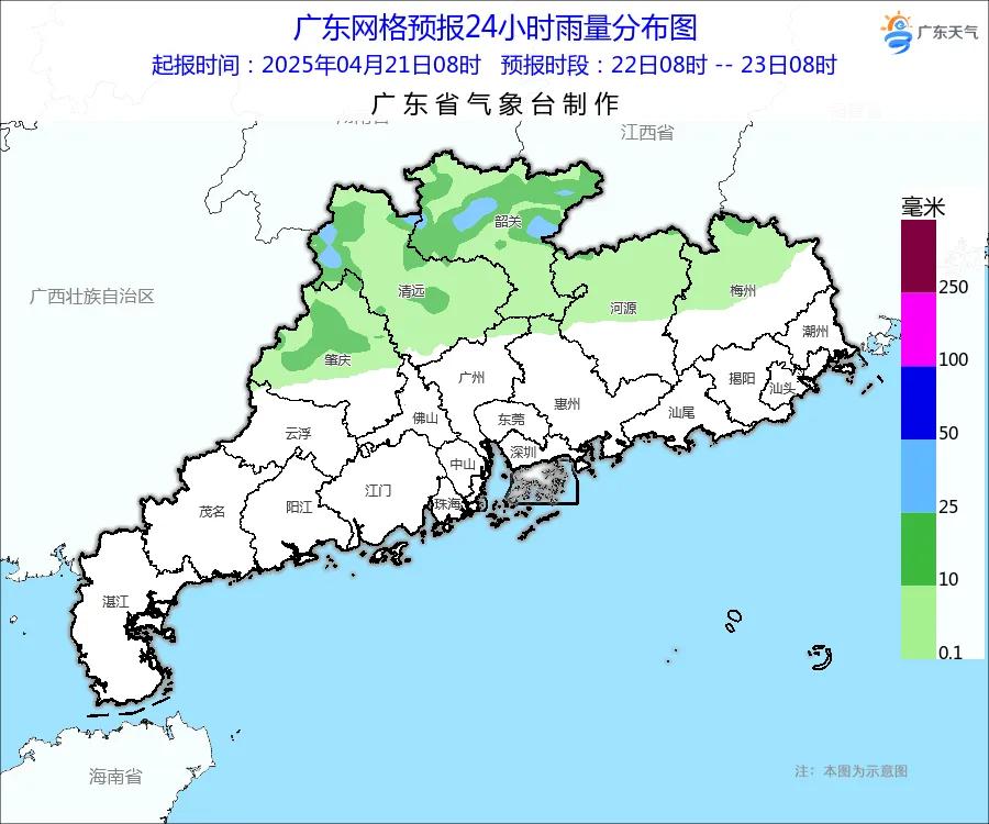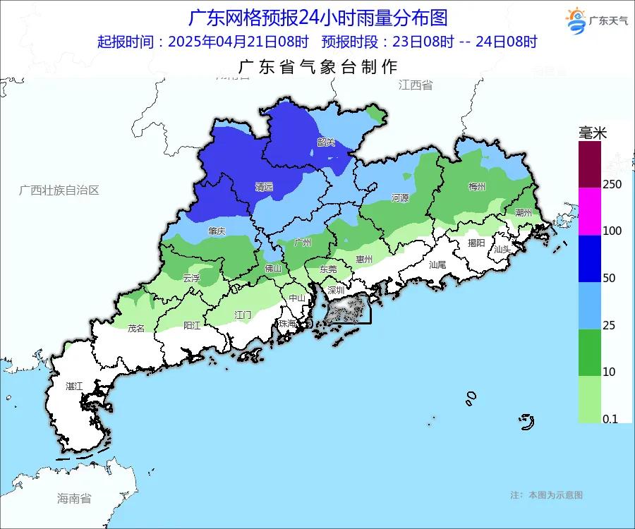 24日-25日,粤北和珠江三角洲有暴雨局部大暴雨,粤东雷阵雨转大雨局部暴雨,粤西有中雷雨局部暴雨,雷雨时伴有8~10级短时大风、短时强降水和冰雹等强对流天气。