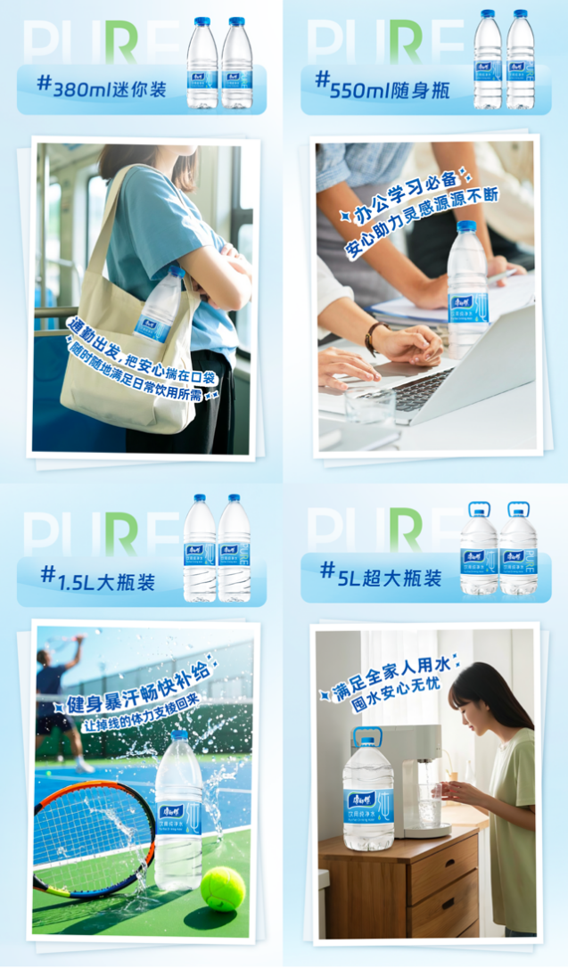 目前,康师傅饮用纯净水有380ml迷你装、550ml随身瓶、1.5L大瓶装、5L超大瓶装四种产品规格,构建并渗透多元化消费场景的同时,全方位满足人们日常饮用所需。