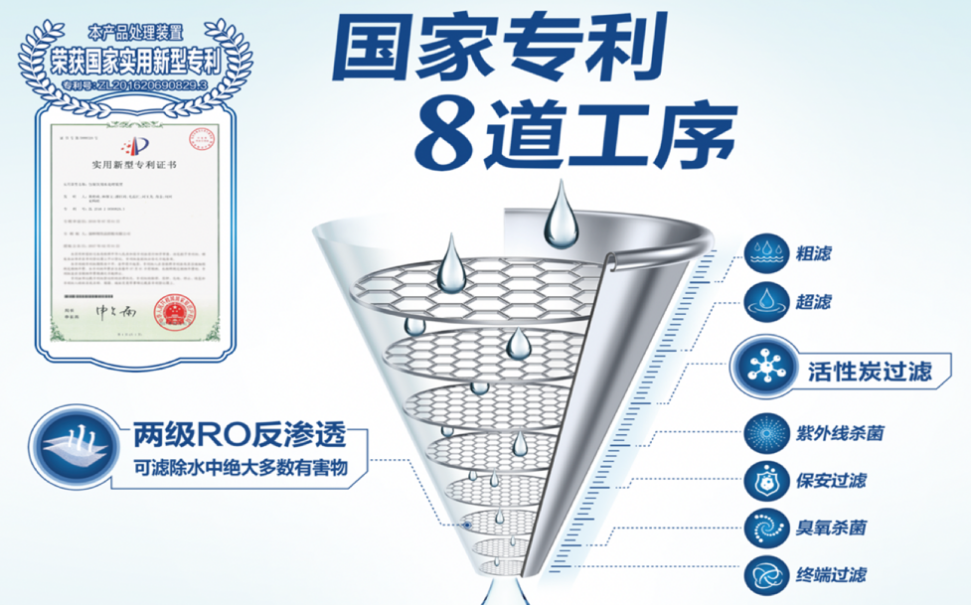 康师傅特有的“八道工序国家专利”(专利号:ZL201620690829.3),成为其打造高品质好水的“秘密武器”。所谓“八道工序”,即康师傅饮用纯净水为每一滴水增设了粗滤、超滤、活性炭过滤、紫外线杀菌、保安过滤、两级RO反渗透过滤、臭氧杀菌和终端过滤八道“关卡”,从生产工艺到内部检验层层把关,保证每一滴水都以更安全、更健康的姿态送达到消费者手中。