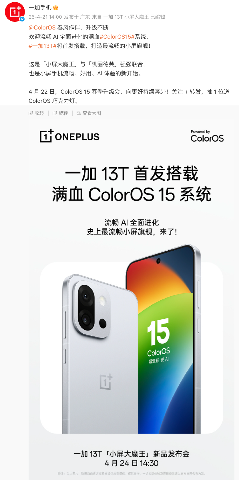 一加这边还预热一加13T将首发搭载满血ColorOS 15,并称其是「小屏大魔王」与「机圈德芙」强强联合,也是小屏手机流畅、好用、AI 体验的新开始,或许也可以把明天当成一加13T的软件体验发布会。ColorOS 15用户可以评论区留言说说你自己的体验~