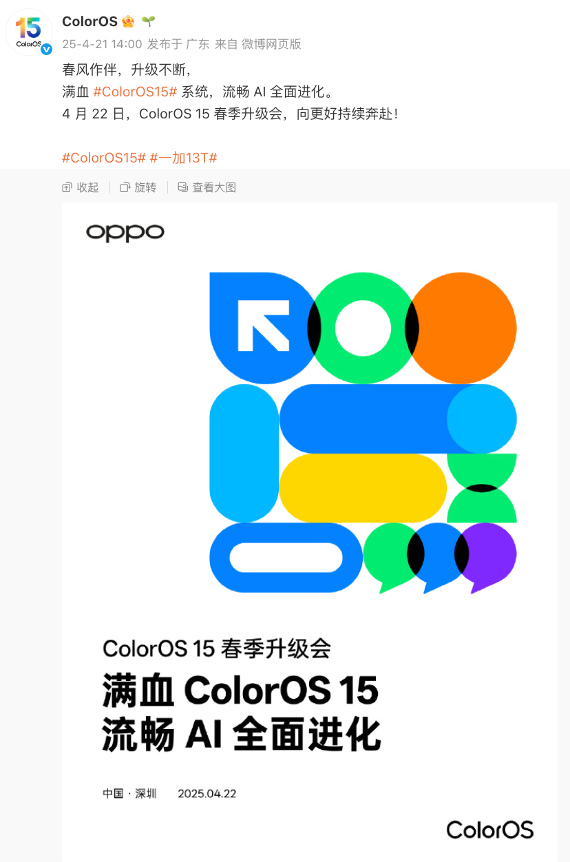 今日,ColorOS官宣将于4月22日也就是明天举行一场春季升级会。