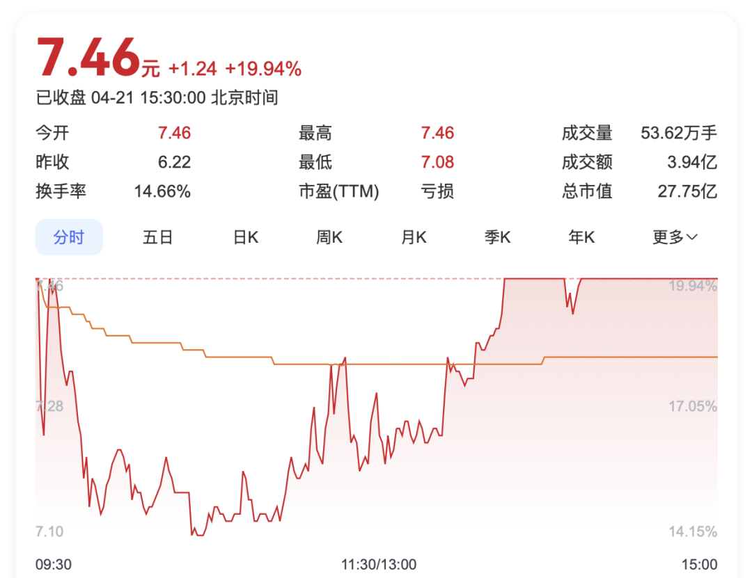 4月21日,琏升科技股票复牌后尾盘涨停。截至当日收盘,该公司每股报7.46元,涨幅19.94%,总市值27.75亿元。