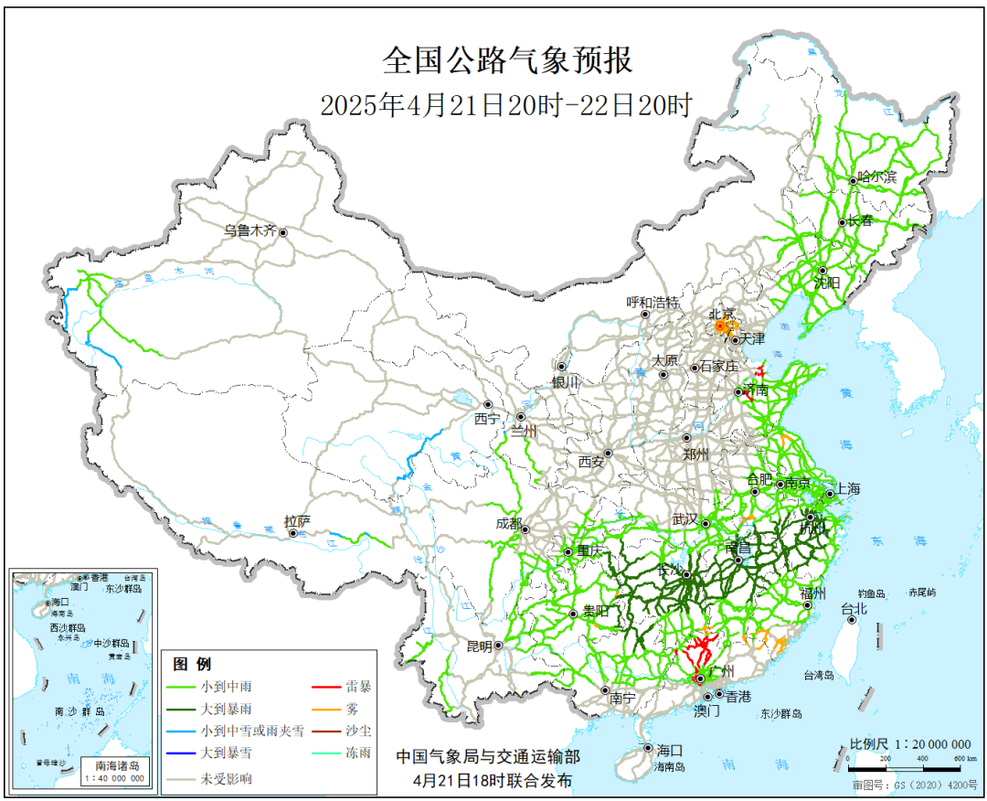 4月21日20时至22日20时,新疆南疆西部山区、青海东南部、内蒙古东北部等地部分地区有小雪或雨夹雪。吉林中部、江淮东部、江南大部以及重庆东部、贵州东部、广西北部、福建西部等地部分地区有中到大雨,其中,湖南中部、江西北部、浙江西部等地部分地区有暴雨到大暴雨。山东北部、广东中部等地局地有雷暴。另外,北京东部、天津北部、江苏东北部、安徽西南部、福建南部、贵州东部等地局地有雾。