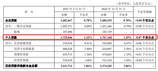 一季度,平安银行个人贷款余额1.73万亿,比2024年末下降了2.2%。其中,信用卡应收账款余额4006.38亿,较上年末下降7.9%;消费性贷款余额4593.15亿,较上年末下降3.2%;经营性贷款余额5296.59亿,较上年末下降0.3%。只有住房按揭贷款余额较上年末增长4.1%,达到了3394.34亿。