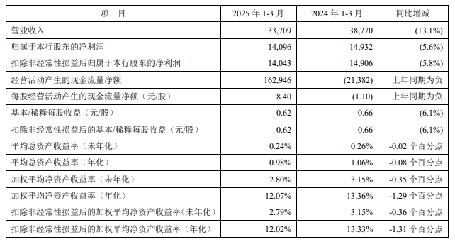 报告期内,该行实现营收337.09亿,同比减少13.1%;实现归属于该行股东的净利润140.96亿,同比减少5.6%。