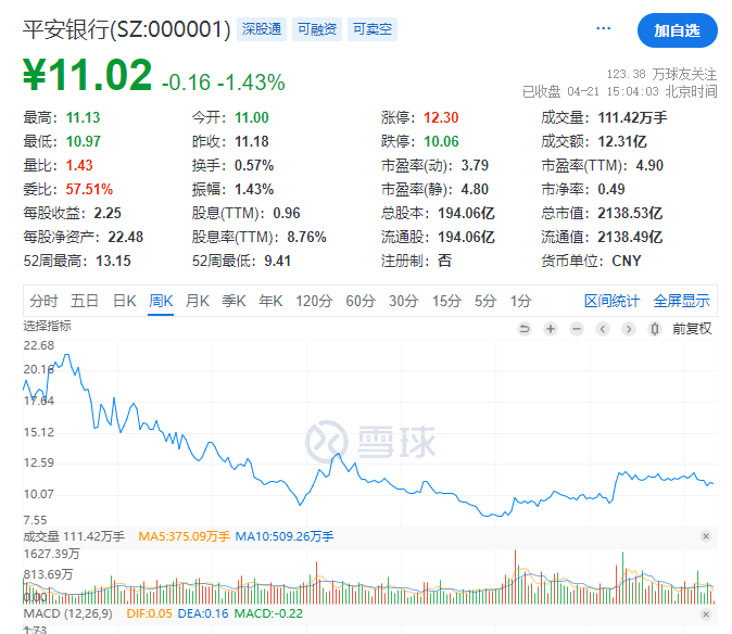 周一(4月21日),平安银行股价下跌1.43%,收于11.02元。