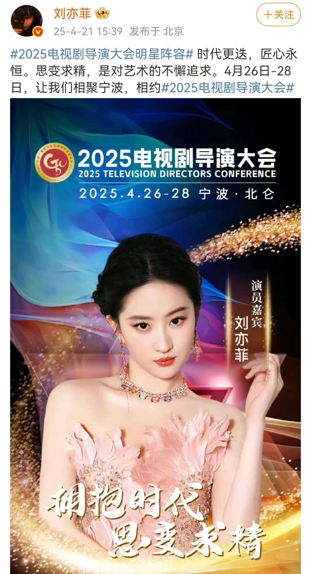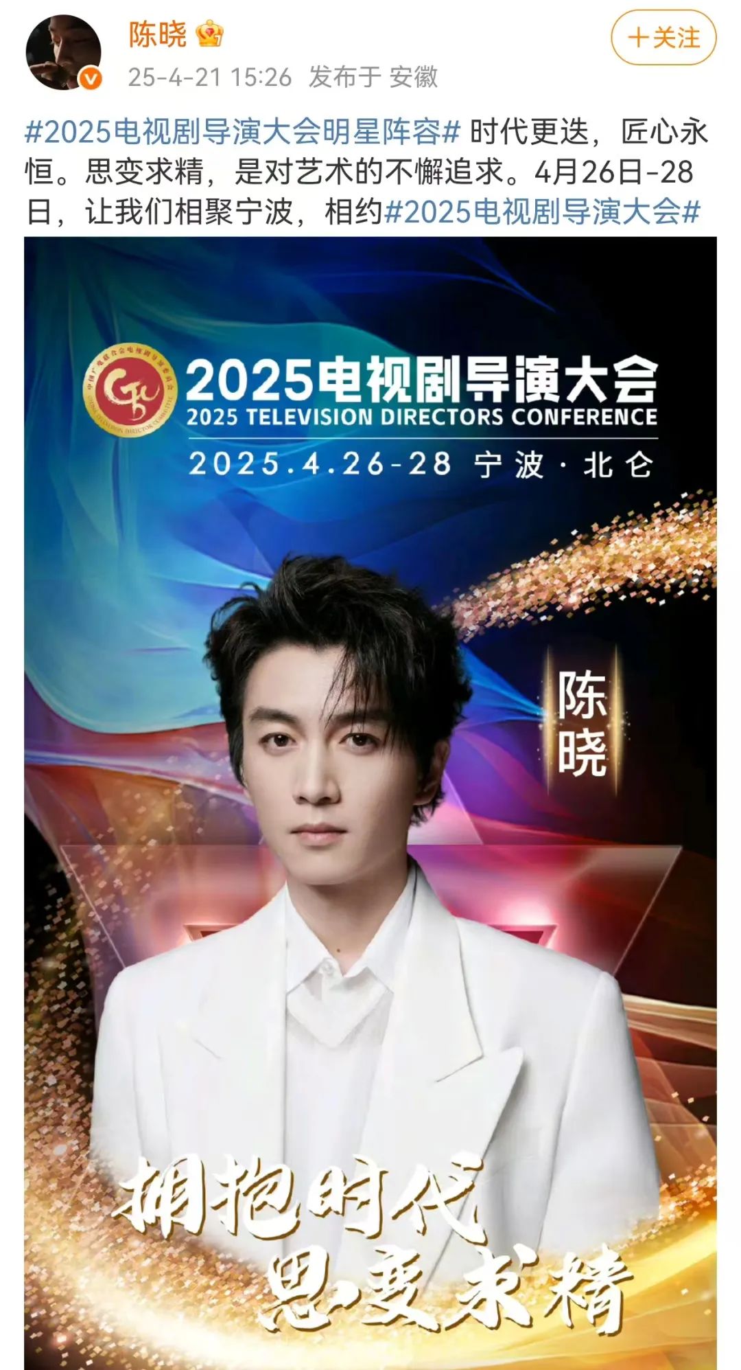 4月21日下午,演员陈晓、刘亦菲相继在个人社交平台发文称:时代更迭,匠心永恒。思变求精,是对艺术的不懈追求。4月26日-28日,让我们相聚宁波,相约。