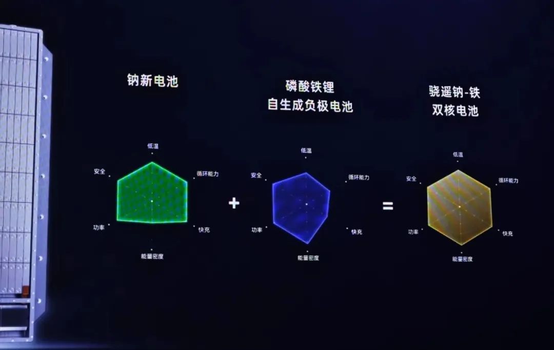 包括行业能量密度最高的钠离子电池,让电池能量密度大幅提升的自生成负极技术,六边形战士骁遥双核电池。