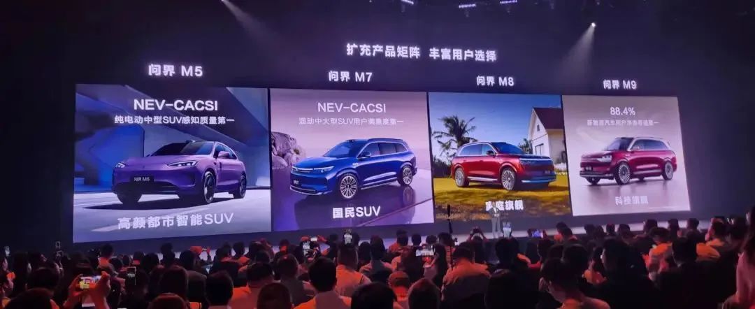 过去几年中,赛力斯通过问界品牌打造了一整个高端智能SUV的产品序列。其中,问界M9定位“全景智慧旗舰 SUV”、问界M8 定位“家庭智慧旗舰 SUV”、问界新M7定位“家庭智慧豪华 SUV”、问界M5定位“高颜都市性能 SUV"的产品标签。