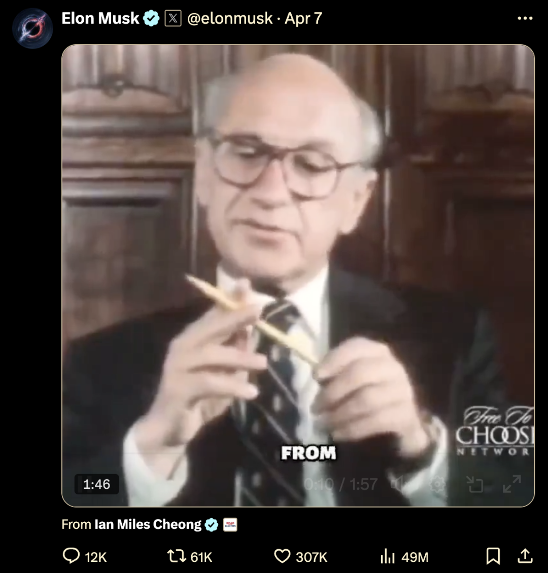 前段时间,特朗普对全球打响关税战,马斯克默默转发了一个视频,这个视频的内容,是一位已故经济学家,讲述一只铅笔的来源。