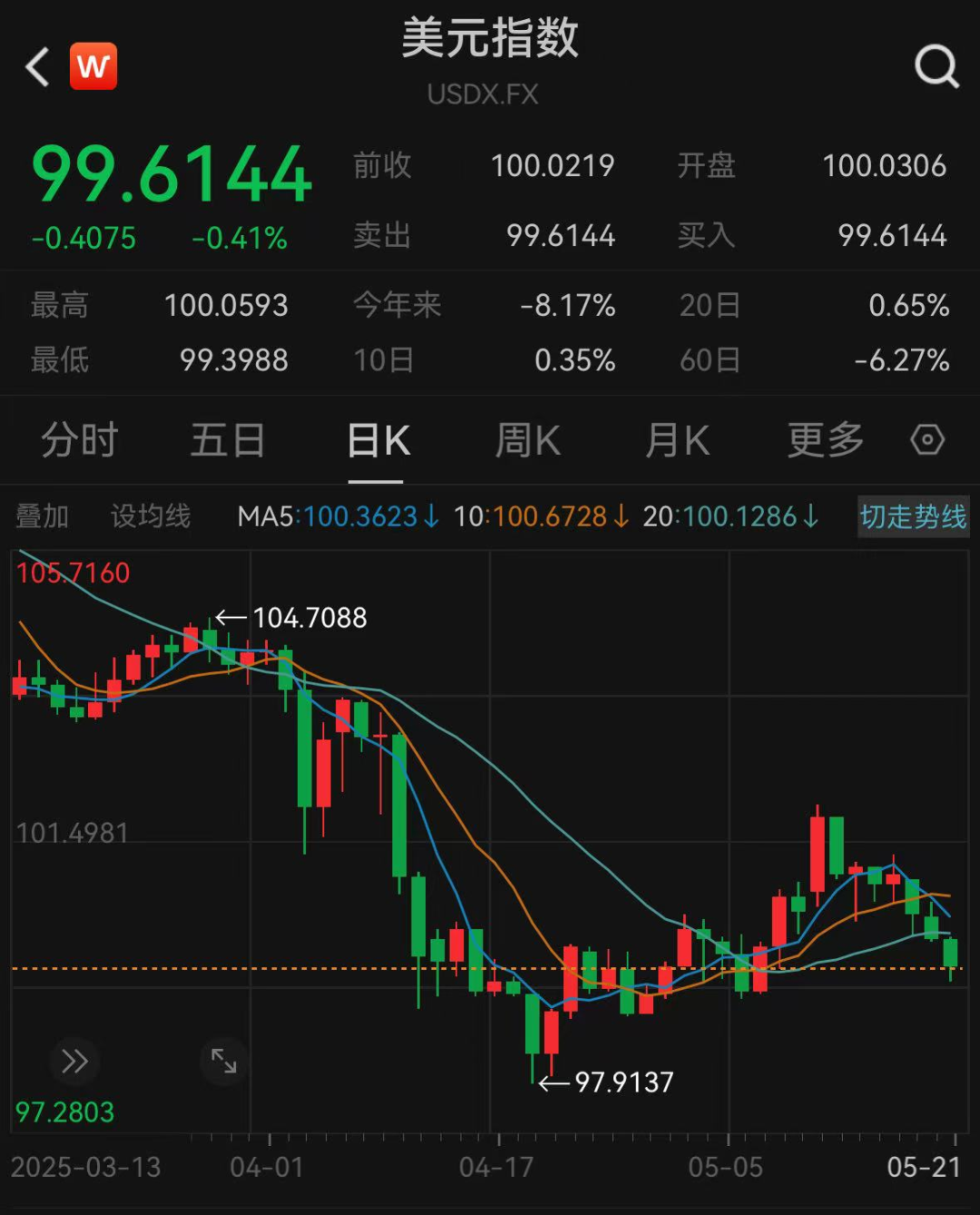 在动荡时期,美元也曾被认为是一种避险资产,但随着美元信用受损,其避险地位正在受到削弱,走出了和黄金截然相反的行情。美元指数5月21日跌破100关口,远低于今年1月110左右的高点。乱局之下,避险资产出现“大分化”。