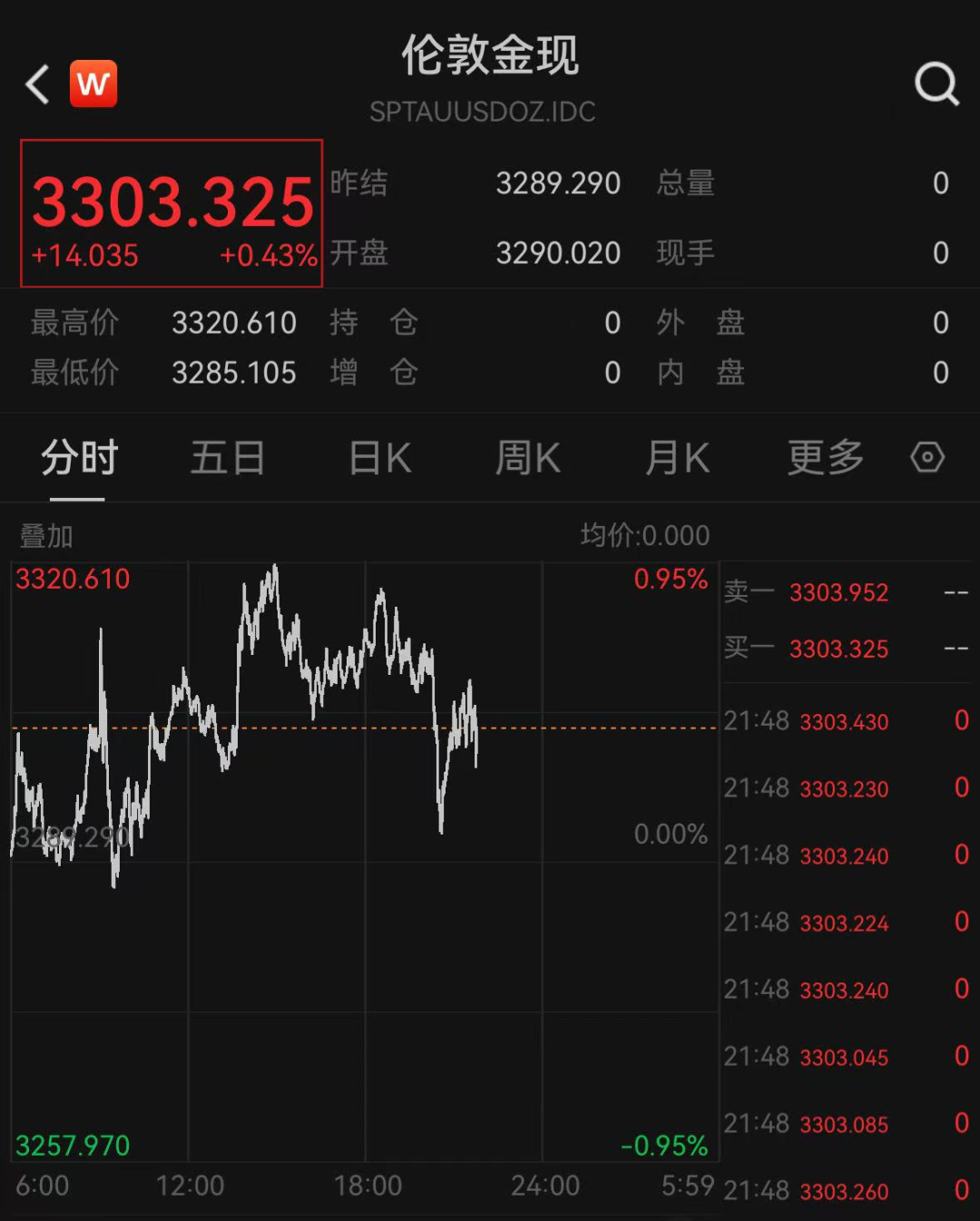 5月21日,现货黄金突破3300美元大关,截至21:45,报价为3303.325美元/盎司。2025年金价已累计大涨逾26%。
