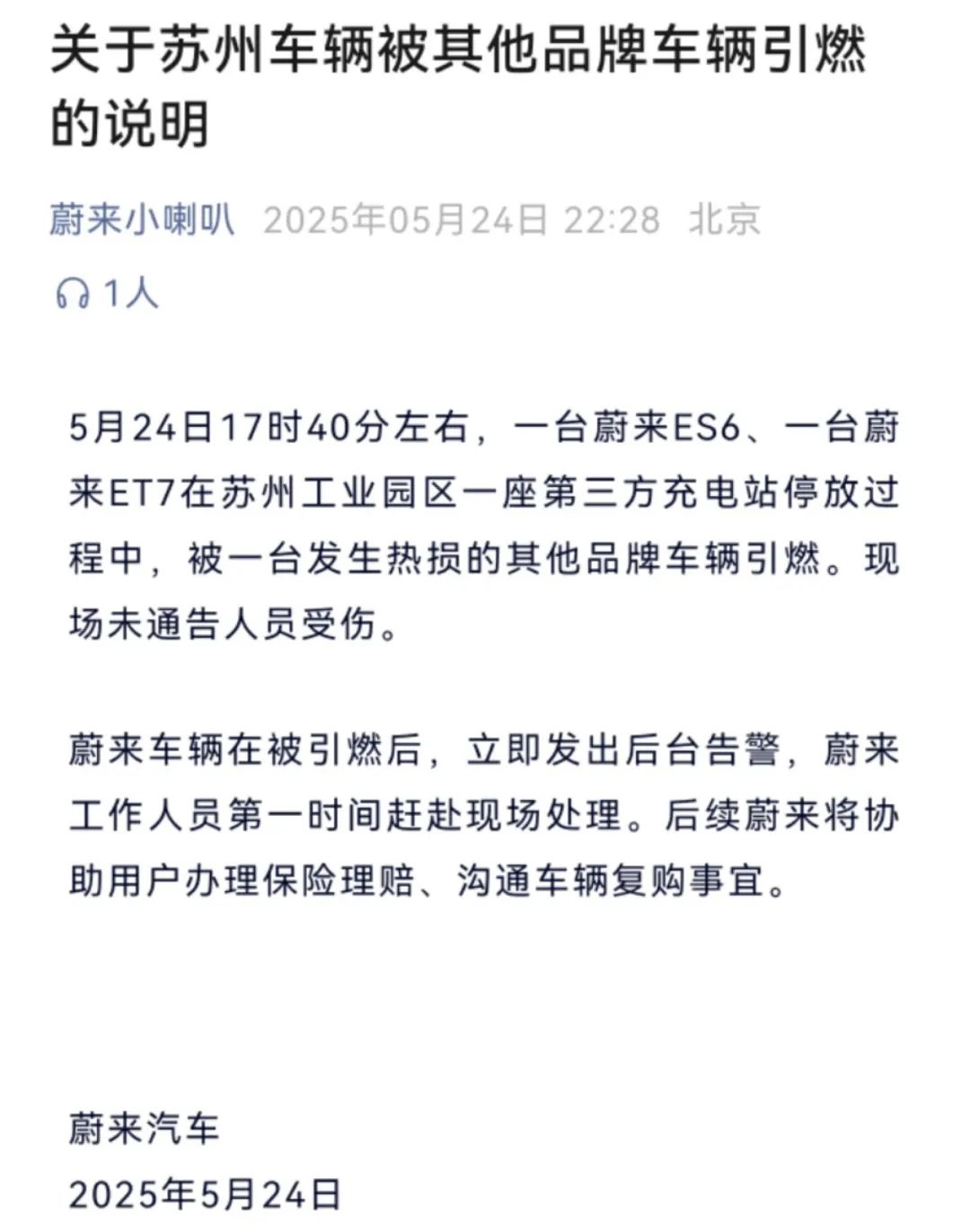 5月24日17时40分左右,一台蔚来ES6、一台蔚来ET7在苏州工业园区一座第三方充电站停放过程中,被一台发生热损的其他品牌车辆引燃。现场未通告人员受伤。