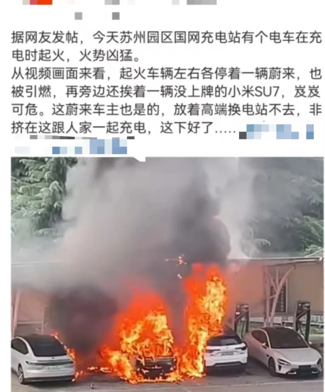 近日有博主爆料称,苏州工业园区某充电站多辆汽车起火,涉事车辆包括蔚来等品牌。