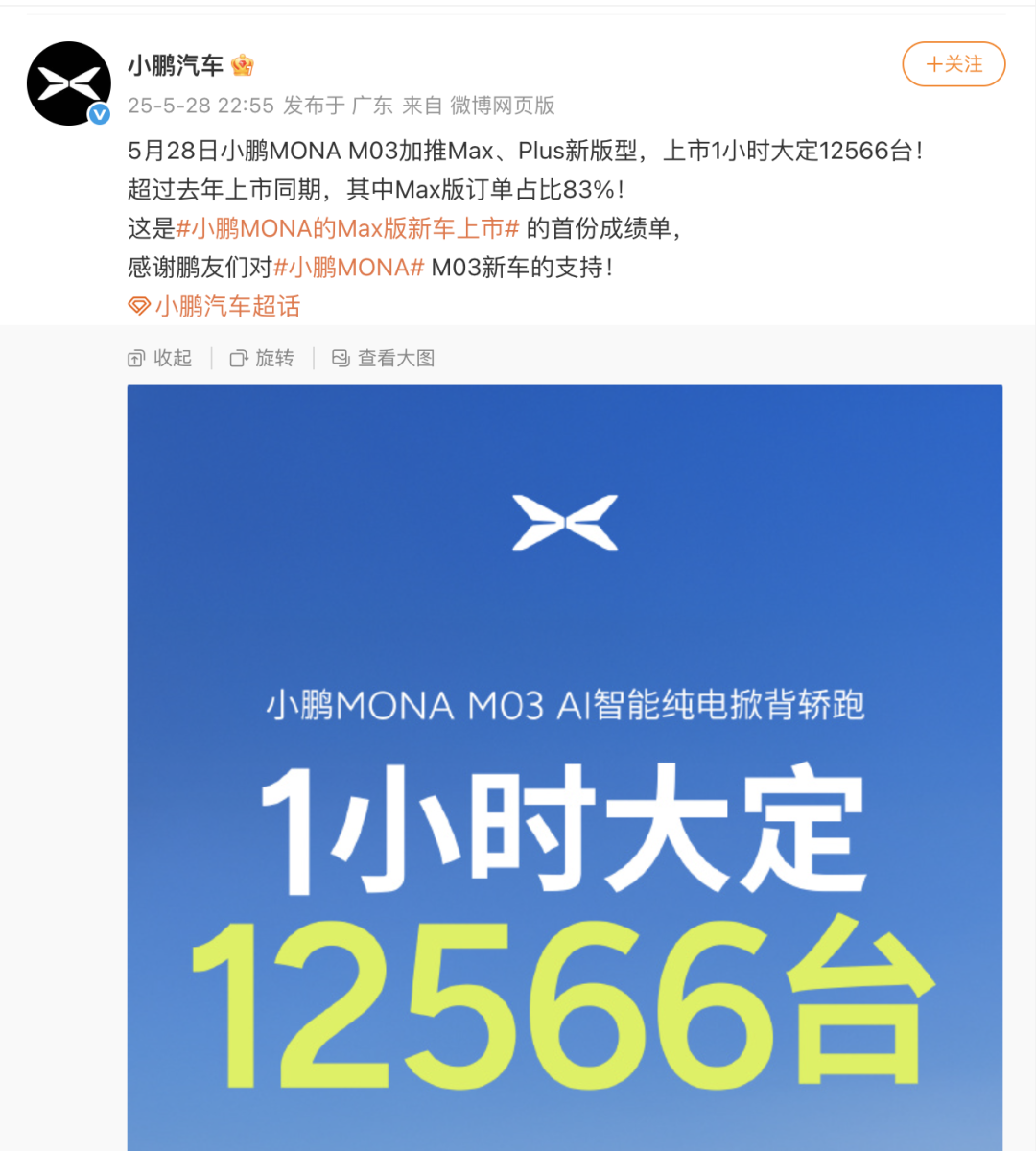 5月28日晚间,小鹏汽车微博宣布:“小鹏MONA M03加推Max、Plus新版型,上市1小时大定12566台!超过去年上市同期,其中Max版订单占比83%!”