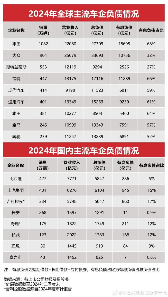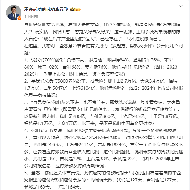 针对比亚迪总负债5800多亿元,他提出,“丰田2.7万亿、大众3.4万亿、福特1.7万亿、吉利5047亿、上汽6104亿,他们危险吗?”
