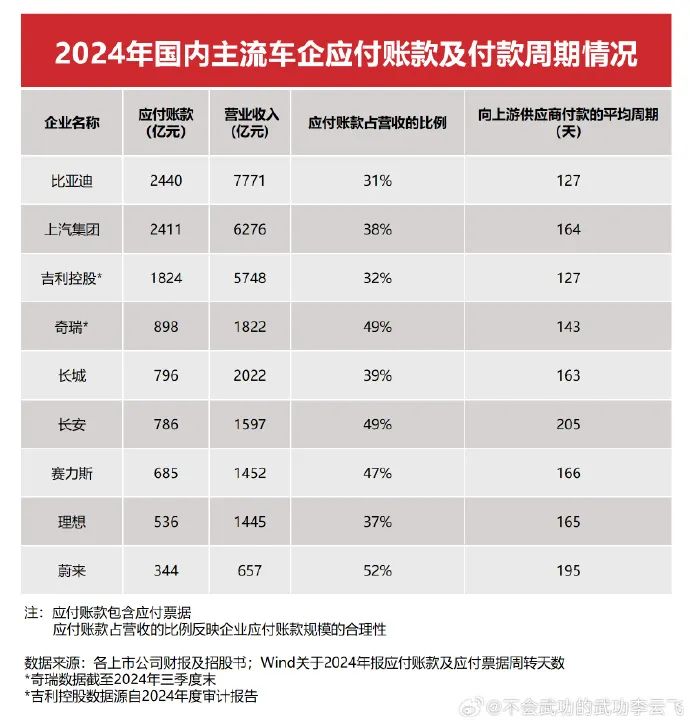 对于供应商的付款周期,李云飞列出:比亚迪为127天、吉利也是127天、长城是163天、上汽是164天。