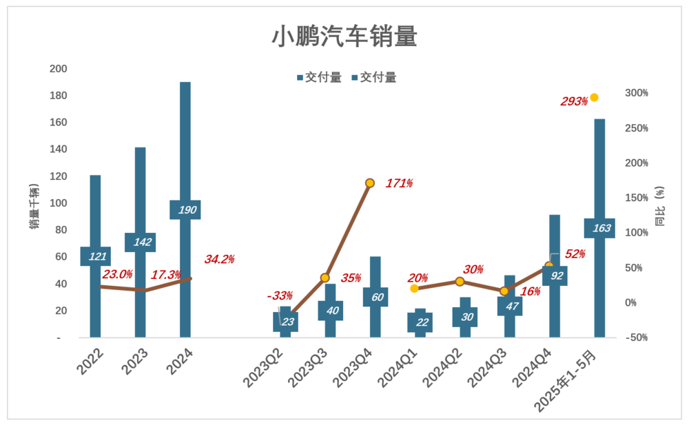 2025年前5个月,小鹏共交付16.3万辆(其中MONA M03约占半数)、同比增长293%。