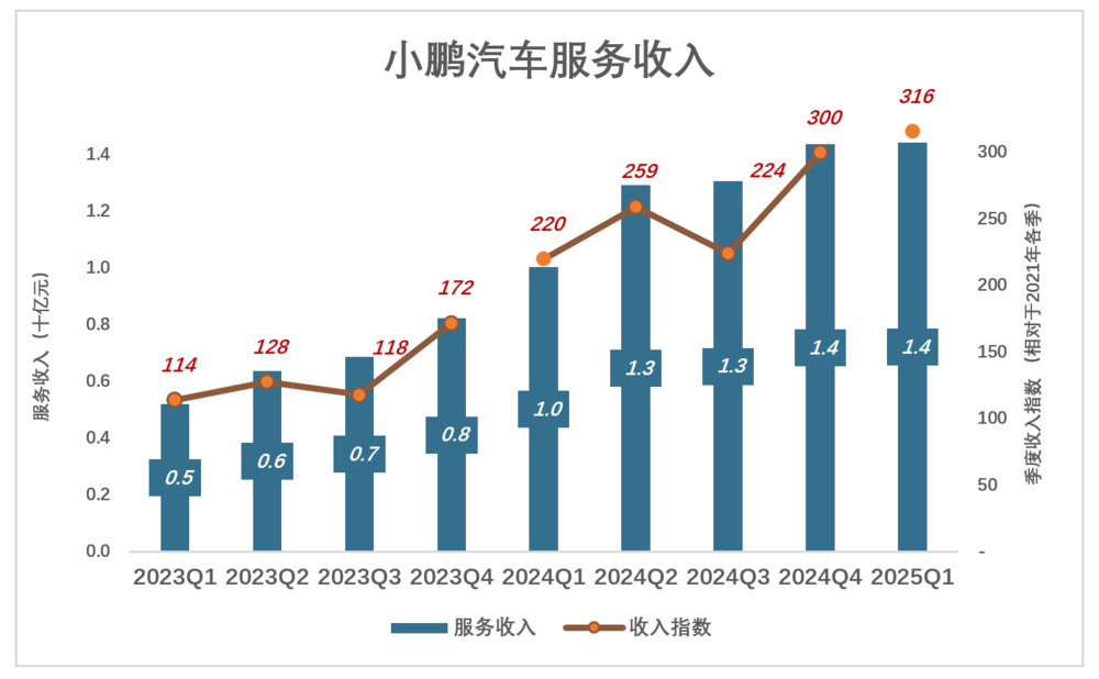 2025年Q1,服务收入14.4亿、收入指数316(相对于2022年Q1);