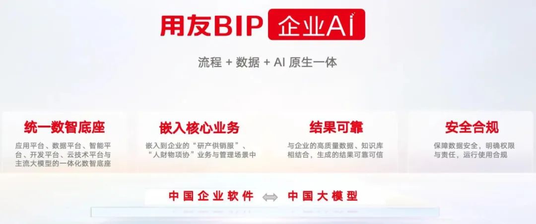 为更好助力AI在企业应用落地,今年3月,用友重磅发布了“用友BIP企业AI”,蕴含的统一数智底座、嵌入核心业务、结果可靠、安全合规的特性,通过“从业务中来,到业务中去”的闭环设计,让AI渗透到企业运营的“毛细血管”里。