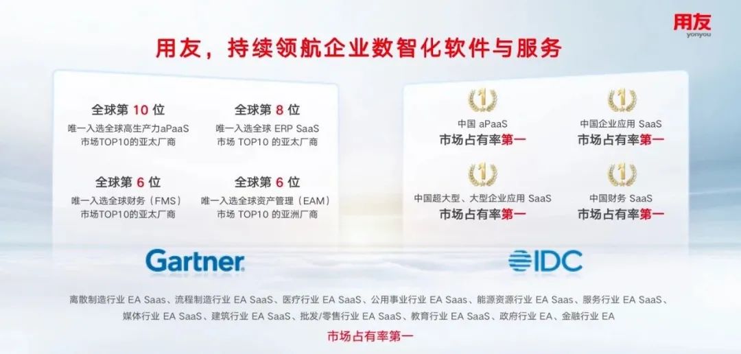 深耕行业37年,用友一路见证行业从寂寥到繁荣,从竞争力来看,其连续多年稳居全球ERP SaaS市场份额前十,在全球财务(FMS)市场和全球资产管理(EAM)市场均进入全球前十,并在中国超大型及大型企业应用SaaS市场,连续多年稳居市场占有率第一。