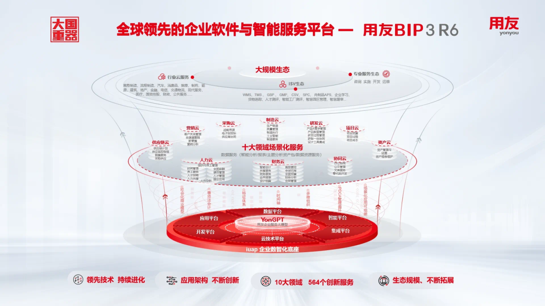 用友BIP是全新一代的企业软件,是一个集PaaS平台、领域应用、行业应用与服务生态为一体的产品体系。