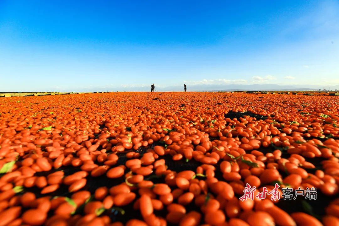 6月26日,嘉峪关市宏源公司1.89万亩头茬枸杞喜获丰收,种植户抢抓晴好天气采摘、晾晒,晾晒场上一片红彤彤的丰收景象。