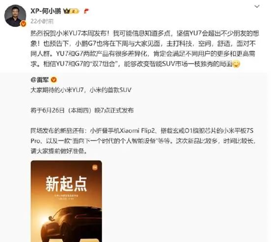 在雷军宣布小米YU7的发布时间后,小鹏汽车董事长何小鹏迅速在社交平台送出祝福。