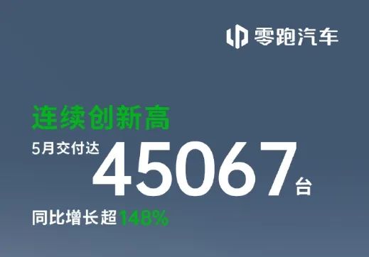 5月份,零跑交付达45067台,增速超148%,连续3个月领跑造车新势力。