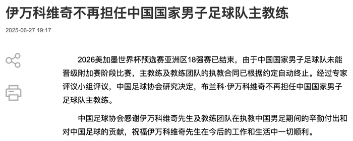 据中国足协网站,2026美加墨世界杯预选赛亚洲区18强赛已结束,由于中国国家男子足球队未能晋级附加赛阶段比赛,主教练及教练团队的执教合同已根据约定自动终止。经过专家评议小组评议,中国足球协会研究决定,布兰科·伊万科维奇不再担任中国国家男子足球队主教练。