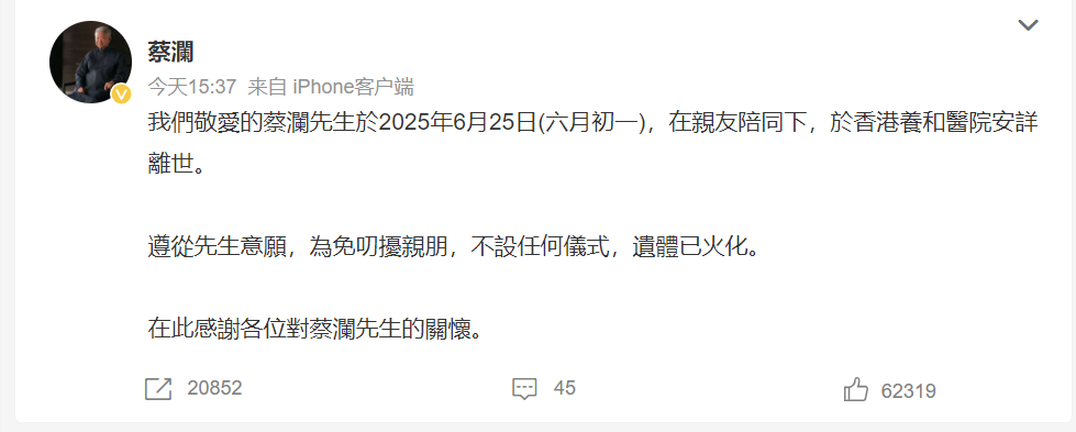 6月27日,蔡澜微博发布消息:“我们敬爱的蔡澜先生于2025年6月25日(六月初一),在亲友陪同下,于香港养和医院安详离世。遵从先生意愿,为免叨扰亲朋,不设任何仪式,遗体已火化。”