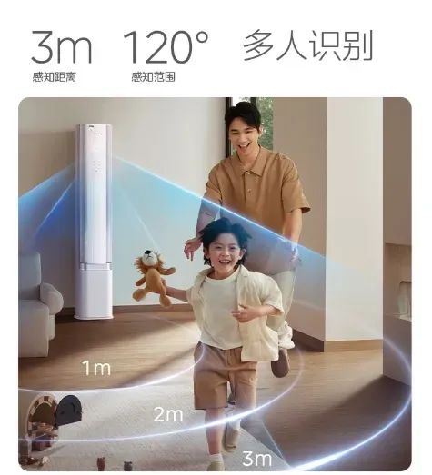 美的无风感空调系列柜机采用了独创的AI无风感技术,搭载了毫米波雷达2.0系统,可智能精准检测空调前方3米120°范围内的人体活动轨迹。
