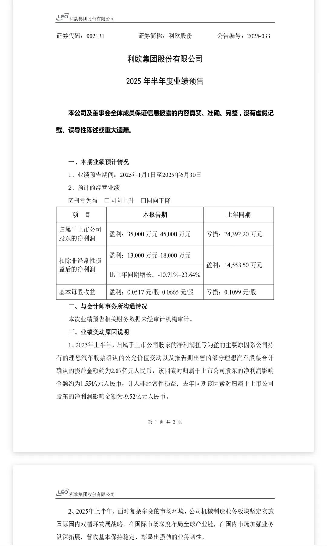 对此,利欧股份解释称:“2025年上半年净利润扭亏是公司持有的理想汽车股票确认的公允价值变动以及报告期出售的部分理想汽车股票合计确认的损益金额约为2.07亿元,该因素对净利润影响金额约为1.55亿元,计入非经常性损益;去年同期该因素对净利润影响金额为-9.52亿元。”